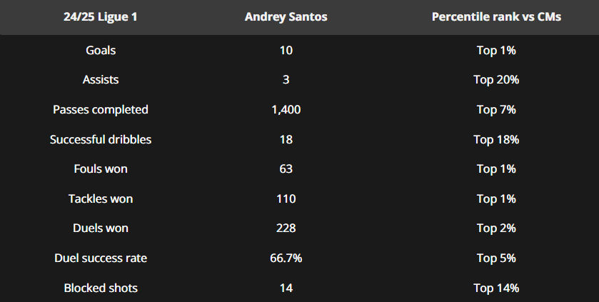 ซานโต๊ส มีสถิติการเอาชนะแท็กเคิ่ล ได้ถึง 110 ครั้ง คิดเป็นท็อป 1% จากจำนวนเซ็นเตอร์มิดฟิลด์คนอื่น ๆ
